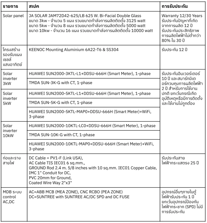 ผู้เข้าร่วมโครงการสามารถเลือกการติดตั้งได้ 3 ขนาด คือ 3kw, 5kw และ 10kw และมีอินเวอร์เตอร์ให้เลือก 2 แบรนด์คือ Huawei และ TMDA
