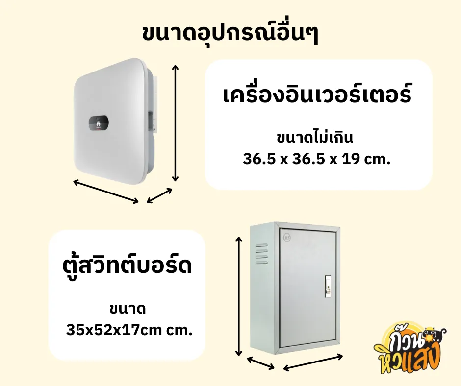 หาพื้นที่สำหรับติดตั้งแผงโซลาร์เซลล์ได้แล้ว อย่าลืมดูพื้นที่สำหรับอุปกรณ์อื่นๆ ได้แก่ อินเวอร์เตอร์ (Inverter) และตู้สวิทช์บอร์ด ซึ่งมีขนาดไม่เล็กและควรอยู่ในพื้นที่ที่ไม่ร้อนและไม่เปียกน้ำ